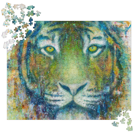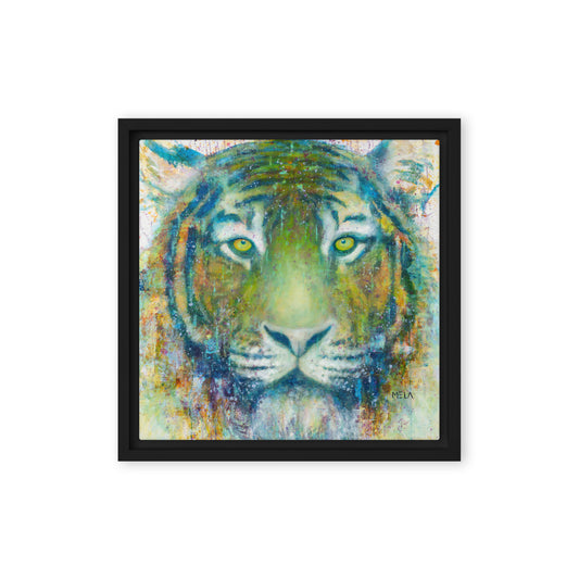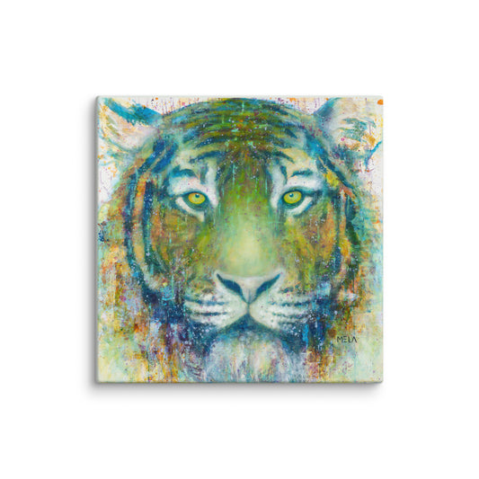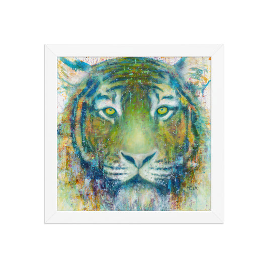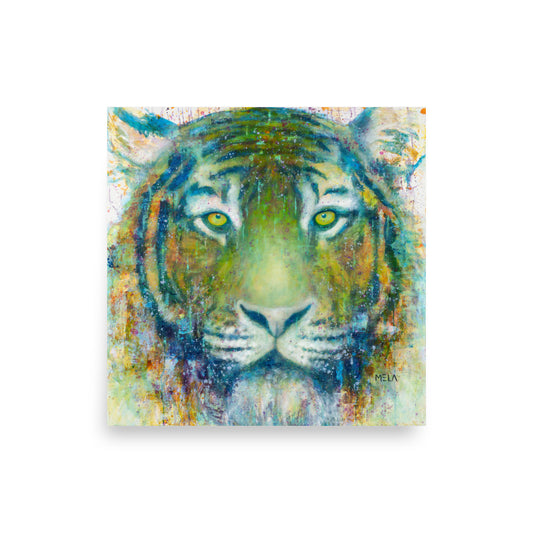 Step into a world of raw power and spiritual energy with Tiger Trance by MELA. This stunning piece explores the mesmerizing duality of the tiger—both fierce and serene—through the dynamic interplay of orange and blue, two complimentary colors that evoke fire and water, vitality and tranquility. The painting radiates an ethereal depth, drawing viewers into a trance-like state to meet the gaze of the tiger, discovering where strength meets introspection.